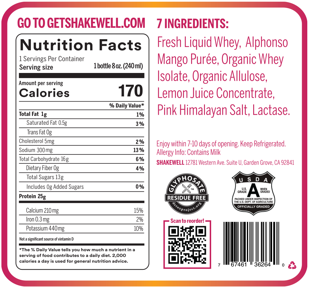 Mango Lassi protein shake from Shakewell. Refreshingly tangy, made with A2 fresh whey, boosted with 25g protein from organic whey isolate, sweetened with organic allulose, no added sugar, 100% lactose free, and no preservatives, gums or emulsifiers. Made fresh, delivered to you on ice!
